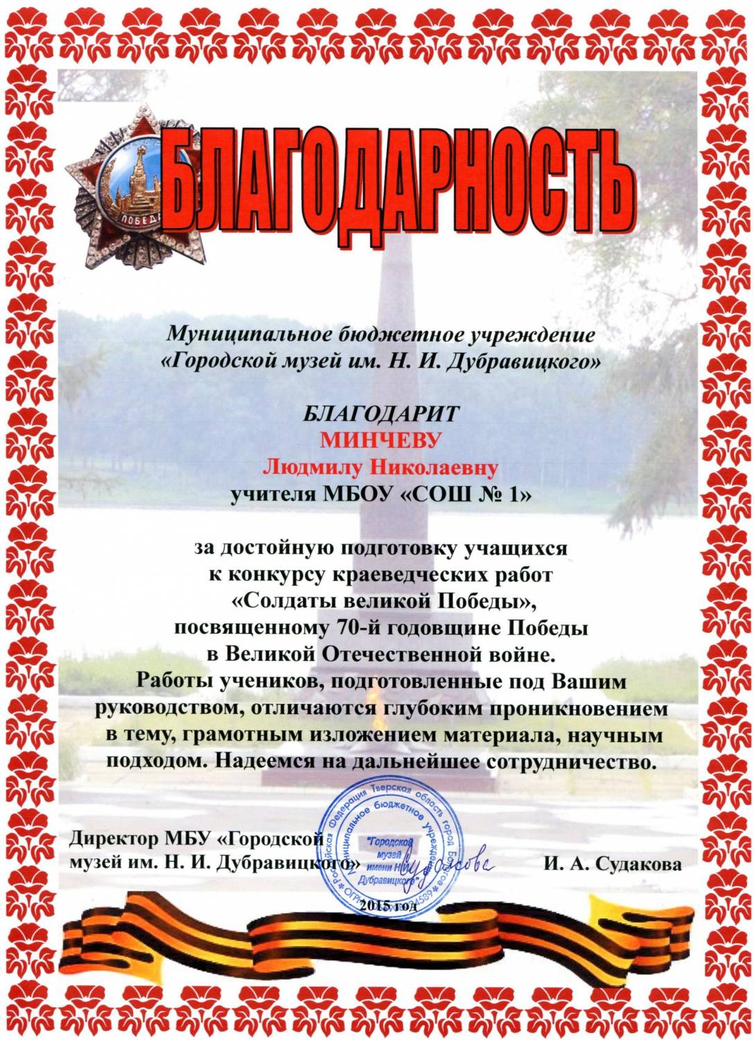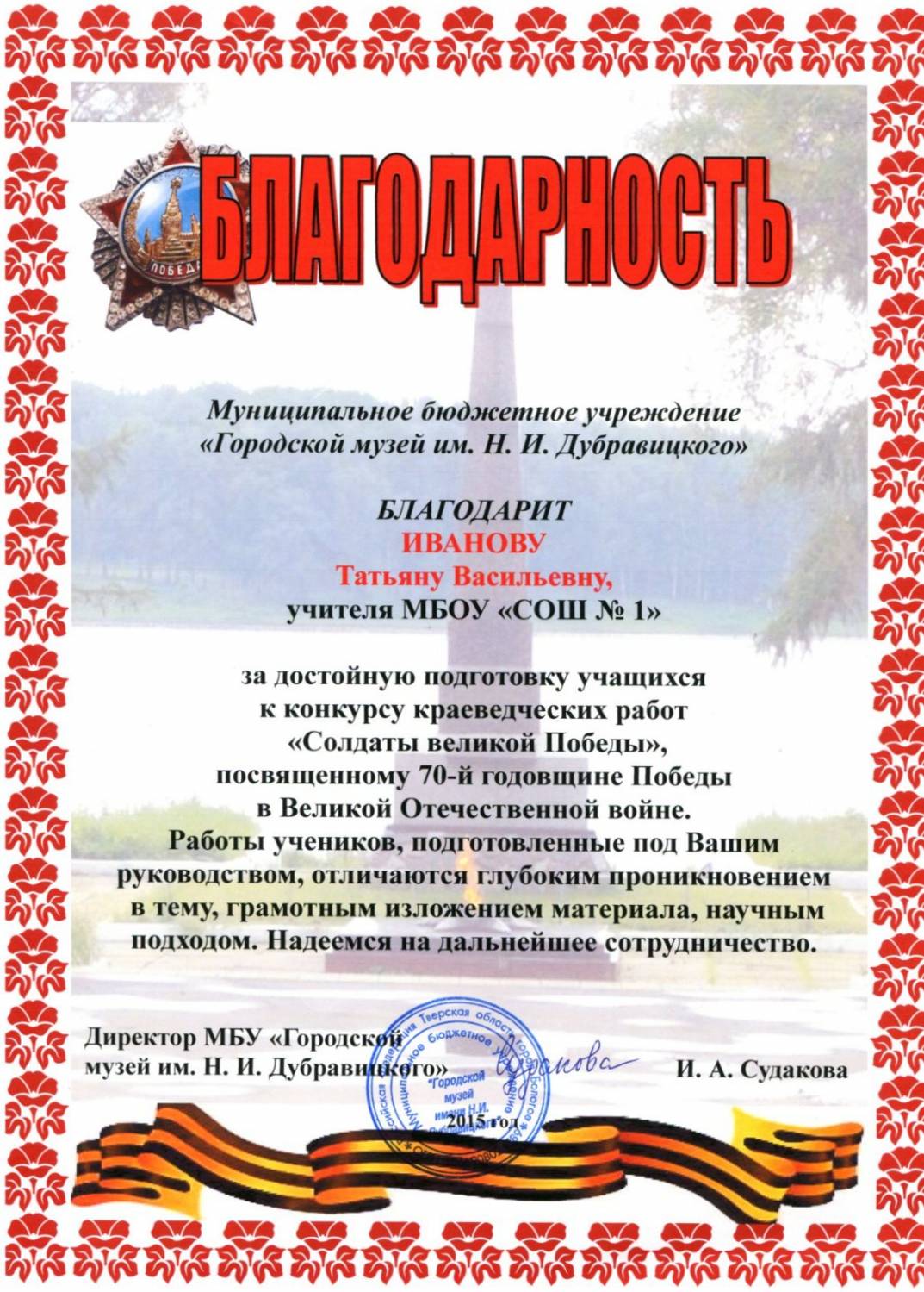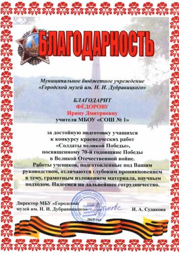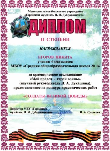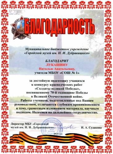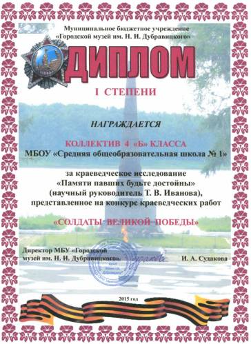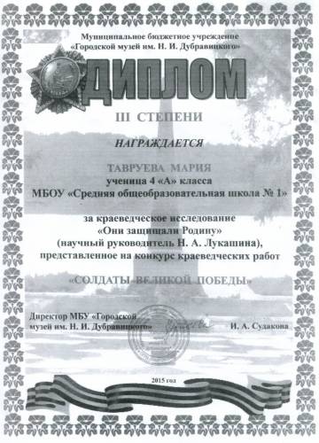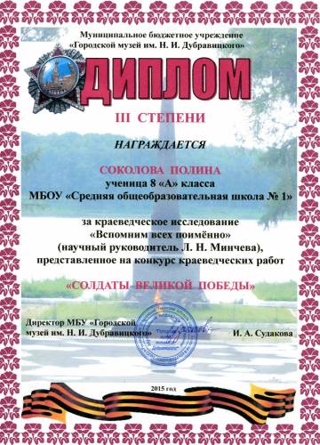 24 апреля 2015 года в городском краеведческом музее были подведены итоги районного этапа конкурса «Солдаты Великой Победы». Всего в конкурсе приняли участие 40 учащихся из школ города и района.