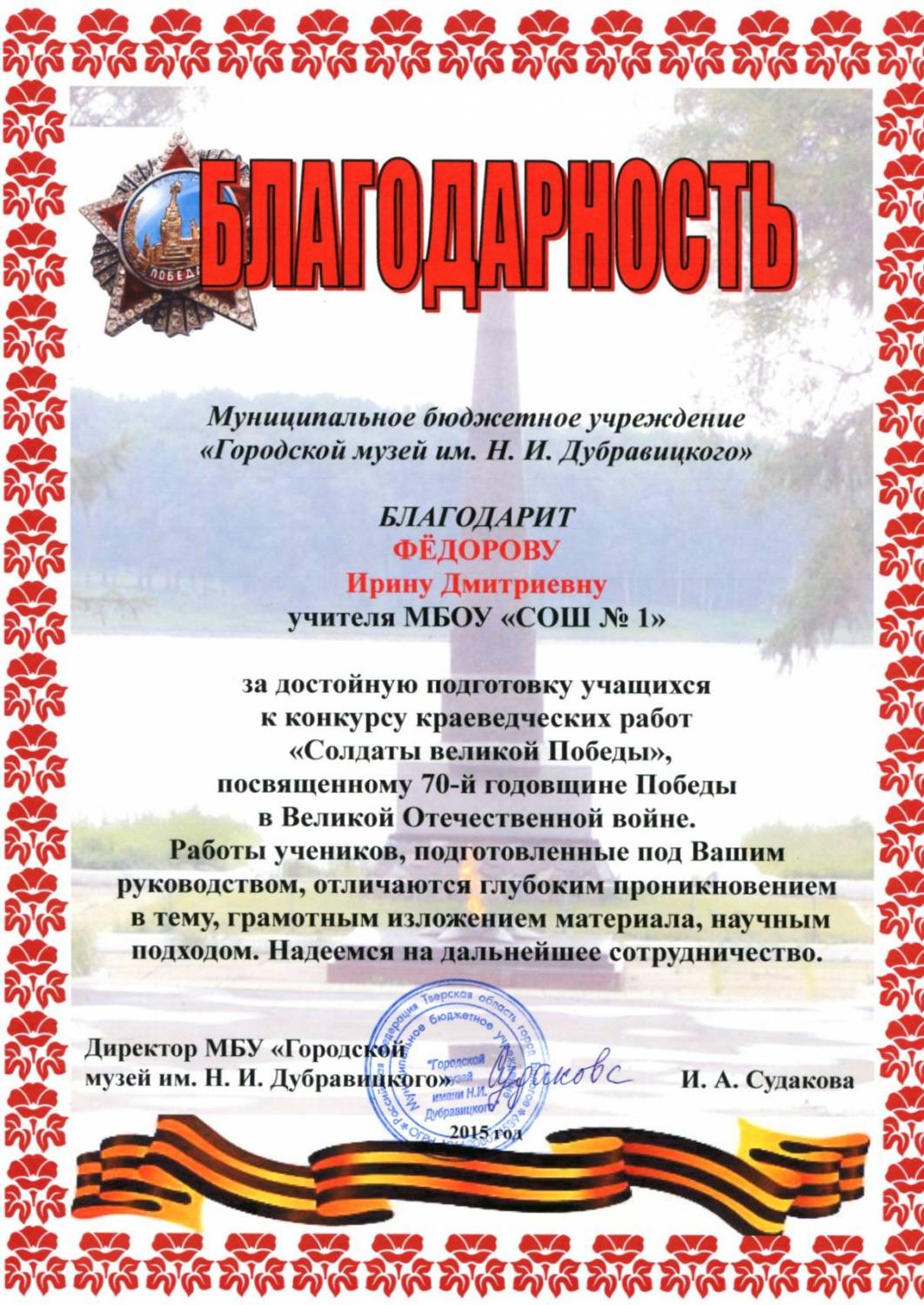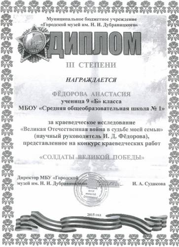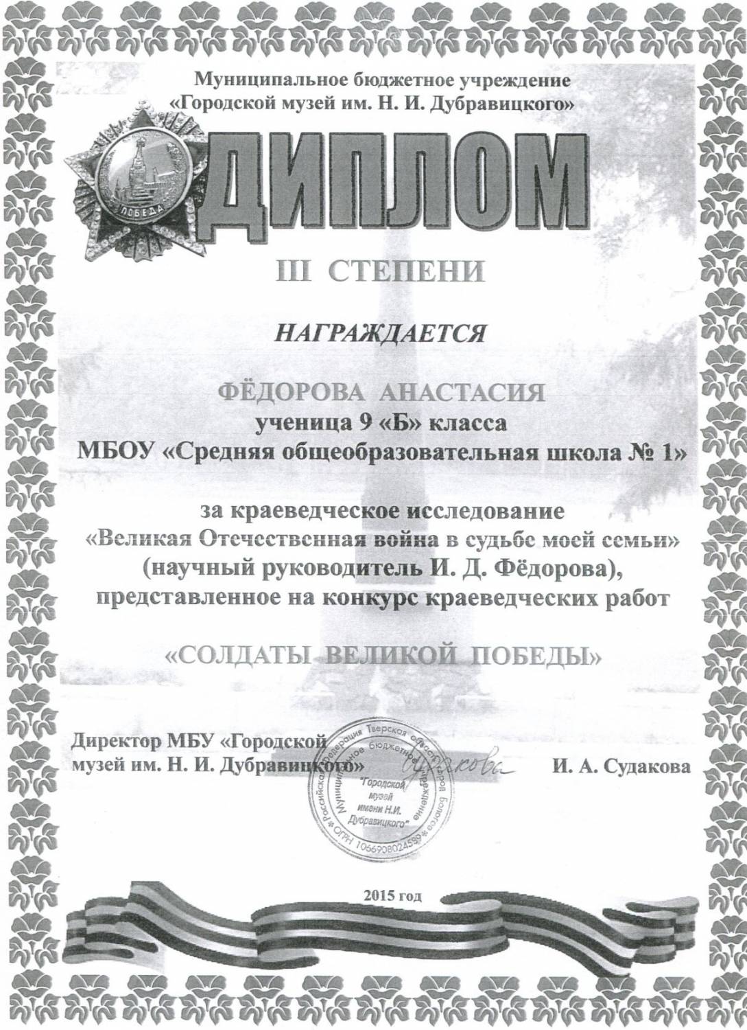 Фёдорова Анастасия. «Великая Отечественная война в судьбе моей семьи. Мой двоюродный прадедушка Фёдоров Фёдор Фёдорович». Руководитель: Фёдорова Ирина Дмитриевна.