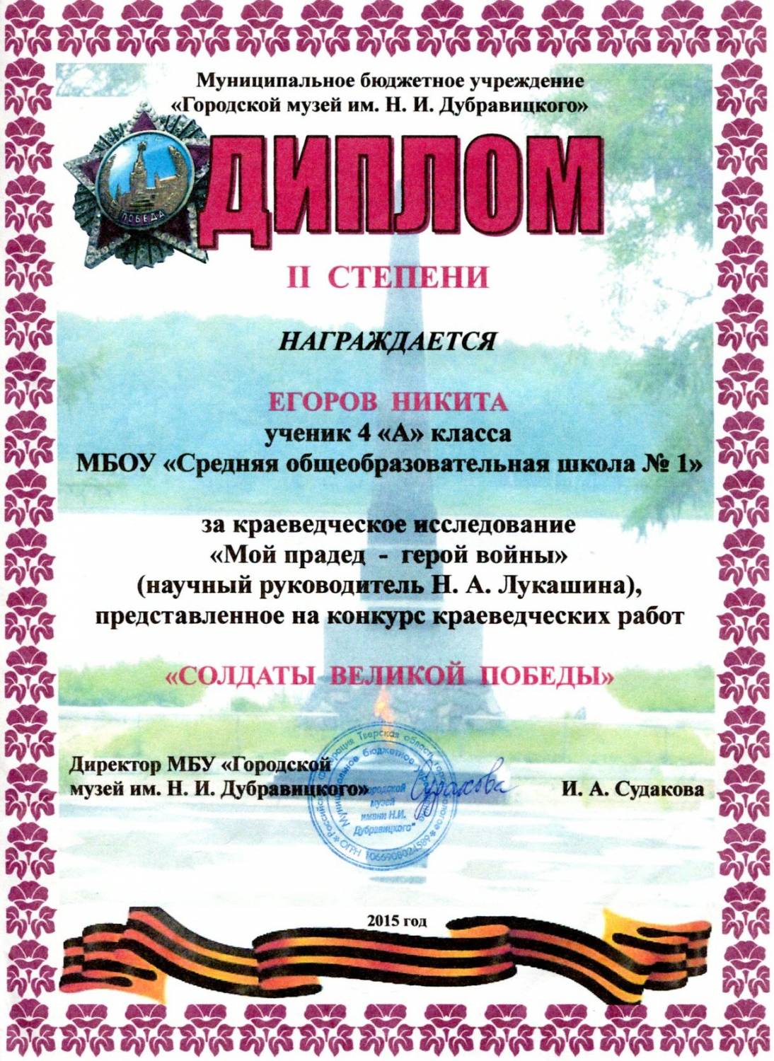 Егоров Никита. «Мой прадед – герой войны». Руководитель: Лукашина Наталья Анатольена.