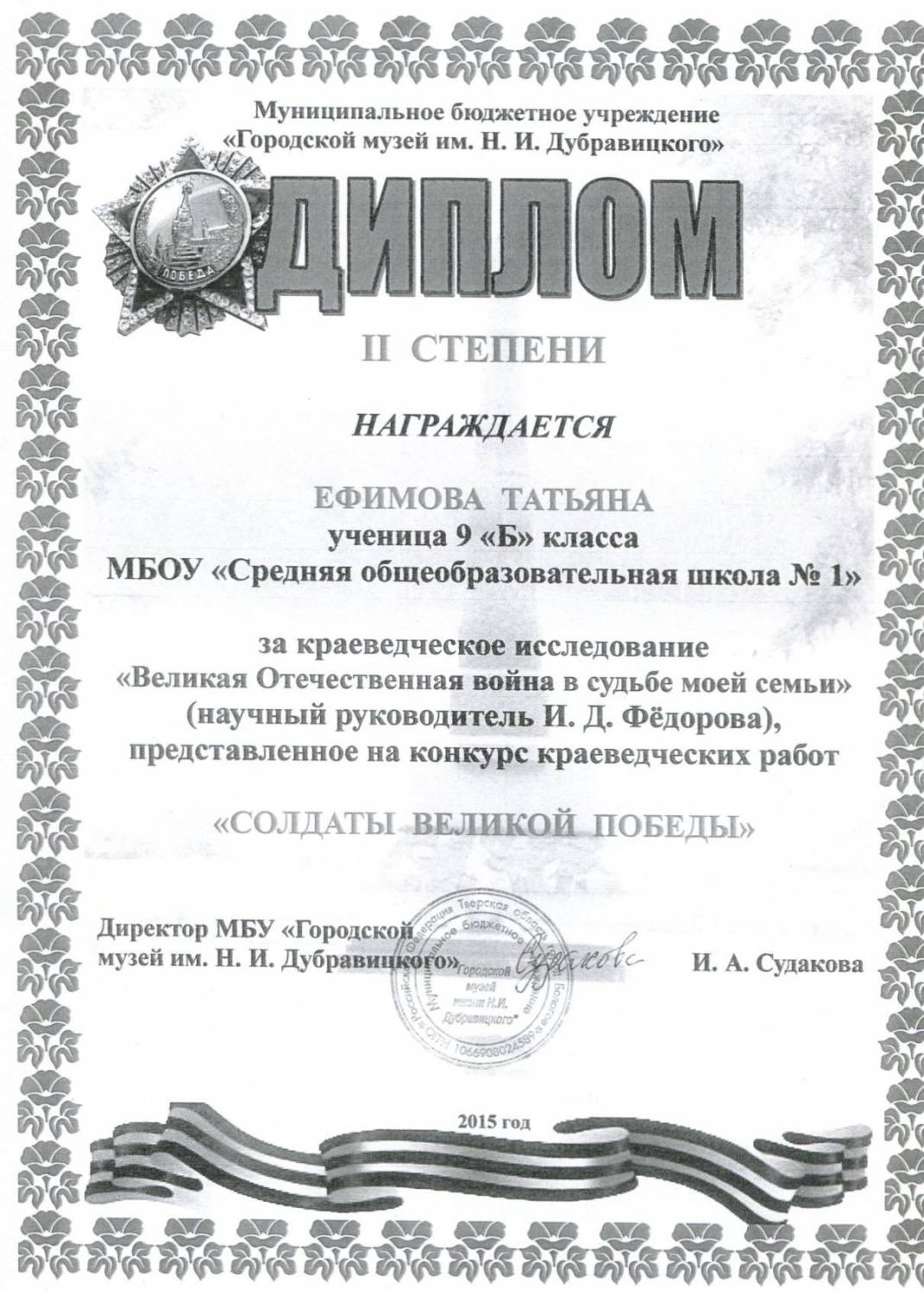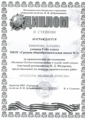 Ефимова Татьяна. «Великая Отечественная война в судьбе моей семьи». Руководитель: Фёдорова Ирина Дмитриевна.