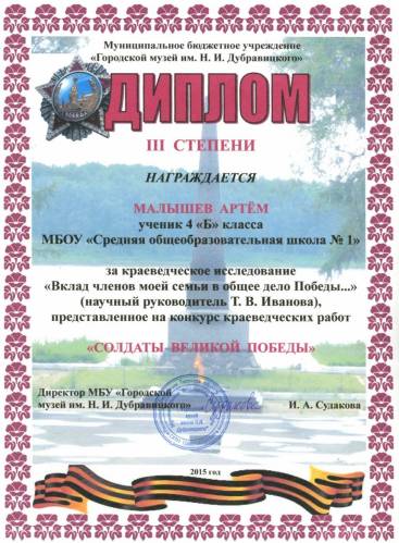 Малышев Артём. «Вклад членов моей семьи в общее дело Победы…». Руководитель: Иванова Татьяна Васильевна.