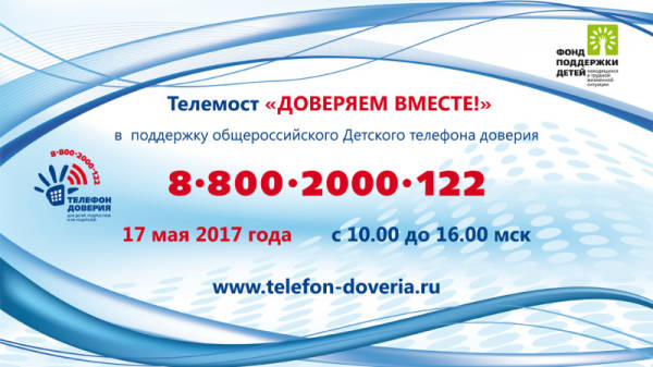 17 мая, в Международный день Детского телефона доверия, всю Россию объединит телемост «Доверяем вместе» в поддержку общероссийского Детского телефона доверия с единым номером 8-800-2000-122.