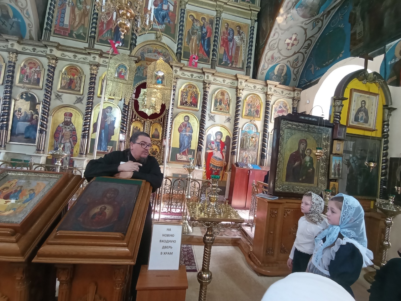 Отец Сергий рассказал о Спасителе, о Таинствах, о светлых праздниках. Священник поговорил с ребятам о вечных человеческих ценностях, которые проповедует Православная Церковь: о дружбе, уважении, прощении, любви к людям и Родине. Настоятель поведал детям об иконах, расположенных в иконостасе и на стенах храма.