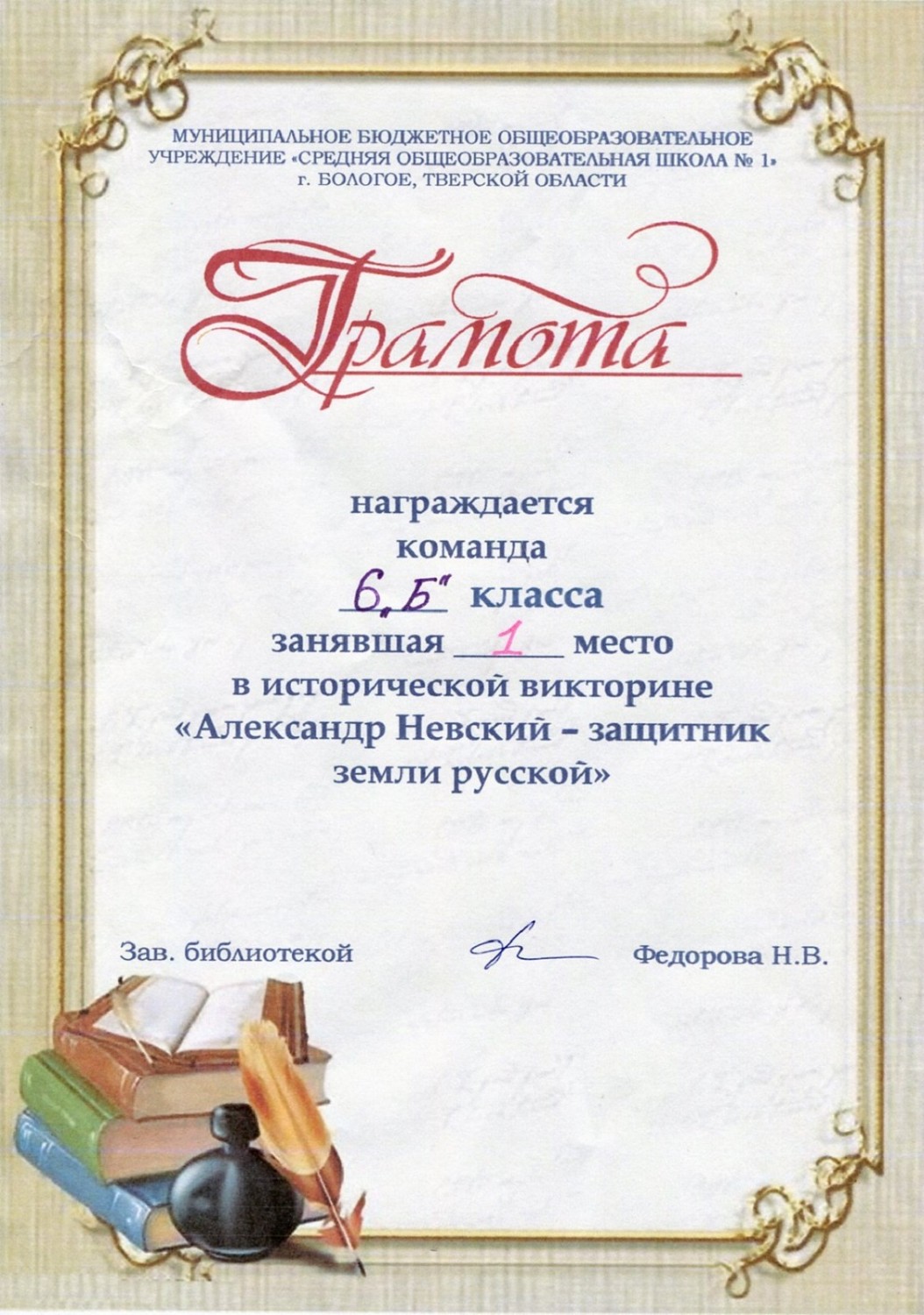 Для учащихся 6 классов заведующая школьной библиотекой  организовала  викторину «Александр Невский. Славные страницы русской истории».  Интеллектуальная игра, посвященная 800-летию со дня рождения святого благоверного князя Александра Невского, проводилась в целях приобщения подрастающего поколения к духовному наследию нашей страны, популяризации духовных и ратных подвигов национального героя нашей страны, христианина, прославленного в лике святых, мудрого политика и выдающегося военачальника, не проигравшего ни одного сражения.
