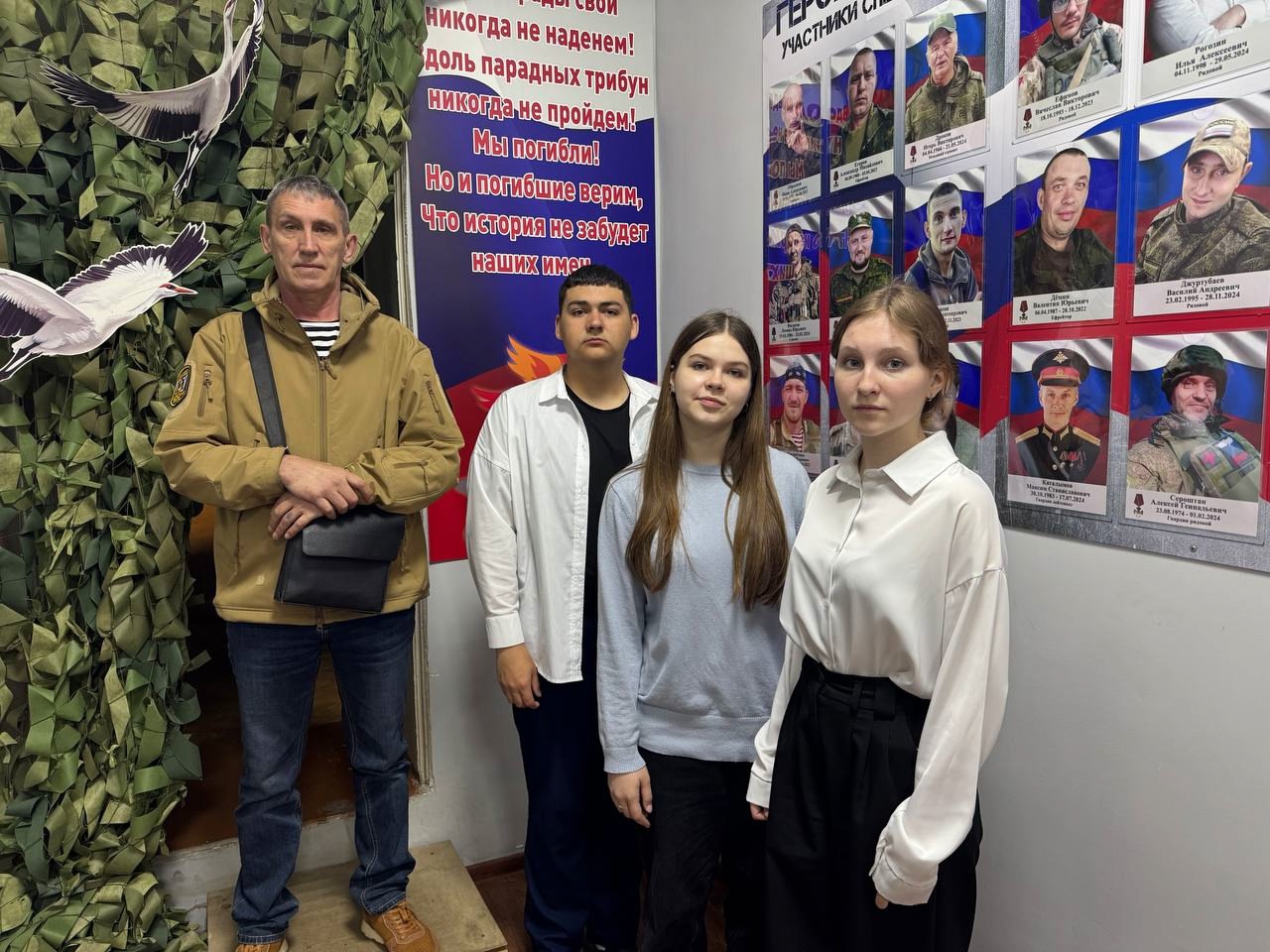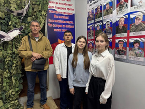 Социальный координатор местного филиала фонда «Защитники Отечества» в Тверской области Алексеева Наталья Евгеньевна и гвардии старший матрос Гусев Михаил Александрович рассказали ребятам о мерах содействия в реабилитации до трудоустройства и профессиональной переподготовки участникам СВО и членов их семей, показали место изготовления плетения маскировочных сетей и доску памяти участникам СВО.
