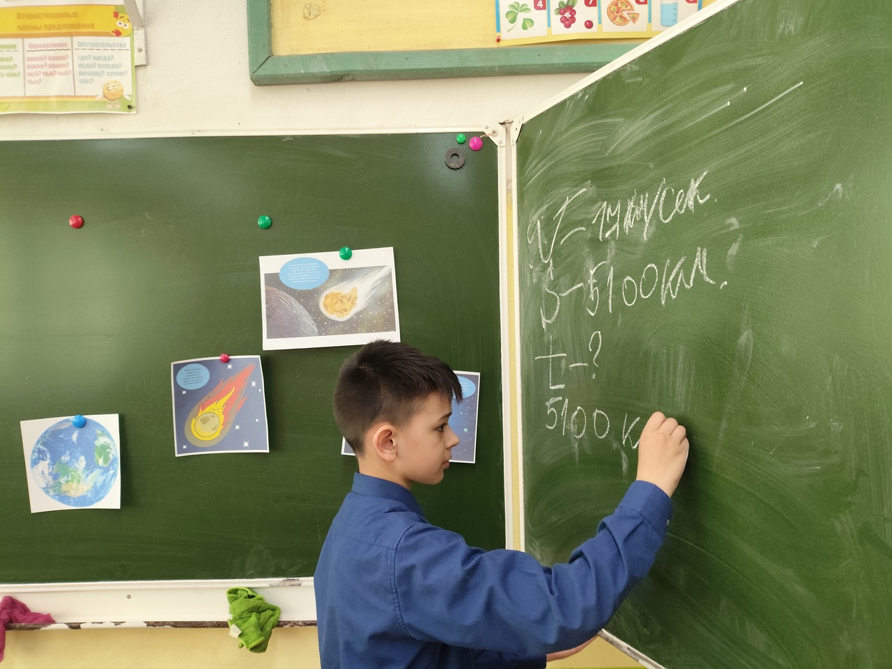 На уроке изобразительного искусства ребята вспомнили о "хвостатых" представителях космического отряда - собаках, первыми покорявших космос. Их портретами к празднику оформили класс. А пятница 11 апреля стала самым "космическим" днем! На уроке математики ребята совершили запуск ракет, работая в группах, и решили задачи, углубляя свои знания о кометах, астероидах, звездах, планетах.