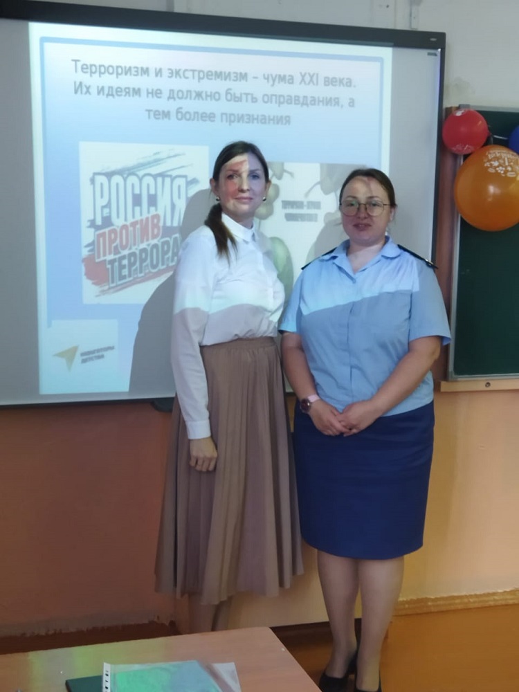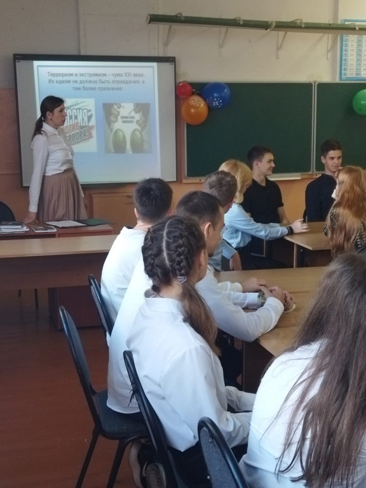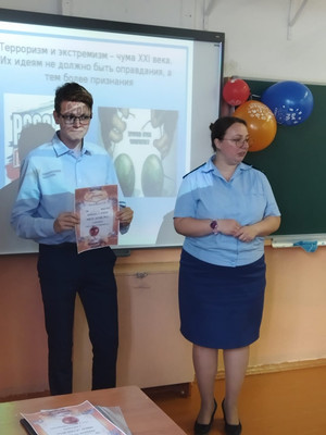 Советником по воспитанию и взаимодействию, Богдановой Анной Владиславовной, проведена викторина «Что мы знаем о терроризме?» для учащихся 10 и 11 классов. Гостем мероприятия стала межрайонный прокурор Шевчук Олеся Леонидовна, которая дала разъяснения по профилактике радикальных проявлений в молодежной сфере.