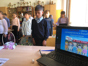 В нашей школе был проведён единый информационный час «Нет терроризму», на котором учителя провели беседу во всех классах с использованием презентации «Имя трагедии – Беслан». Затем все почтили память погибших в этой страшной трагедии минутой молчания. Также ученики вторых, седьмых и девятых классов присоединились к Всероссийской акции «Капля жизни», приуроченной ко Дню солидарности в борьбе с терроризмом и к трагедии в школе города Беслан, где участники мероприятия из чаши с водой набирали воду ладошками и с пожеланиями светлой памяти всем безвинно погибшим, напоили цветы и деревья.