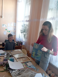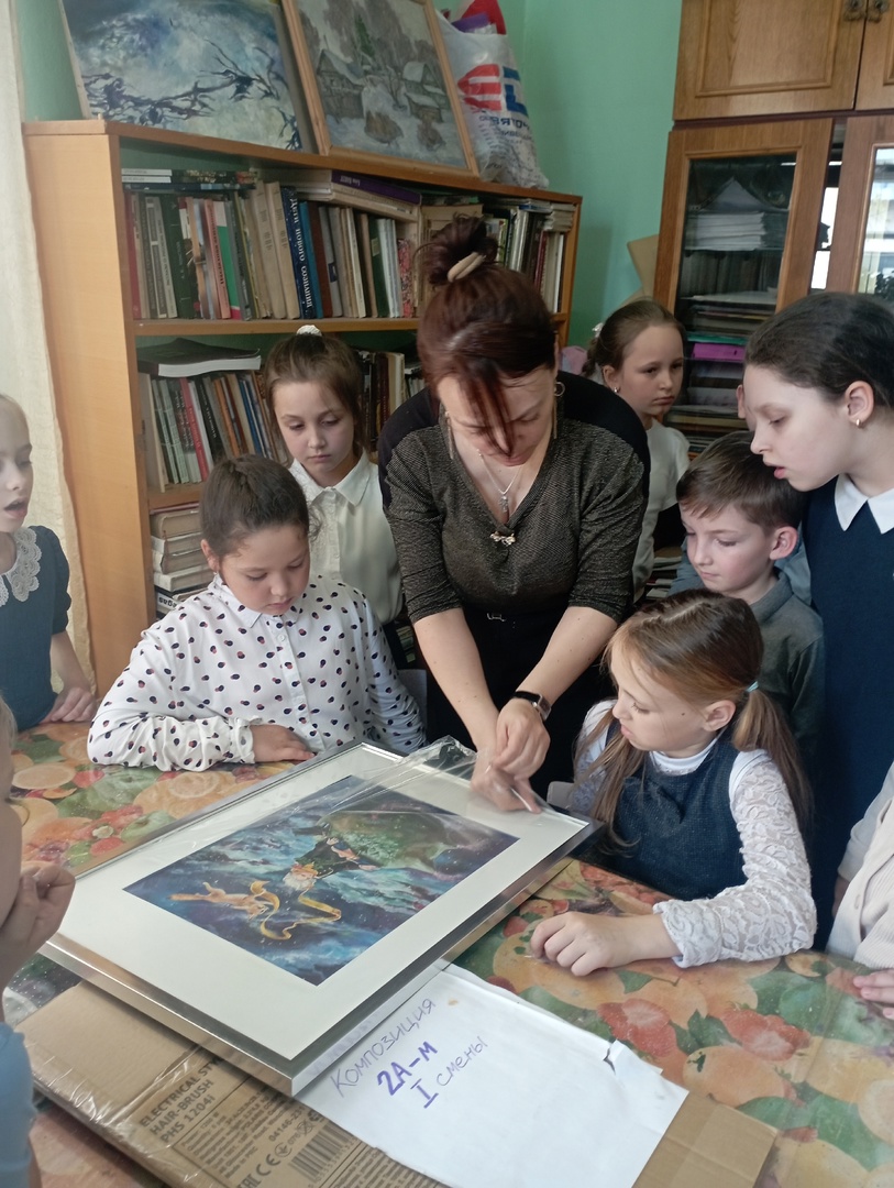 Дети с интересом рассматривали живописные и декоративные произведения преподавателей и обучающихся школы, внимательно слушали Татьяну Сергеевну и задавали интересующие вопросы. Татьяна Сергеевна показала ребятам действующие выставки, провела по кабинетам-мастерским живописи и рисунка.