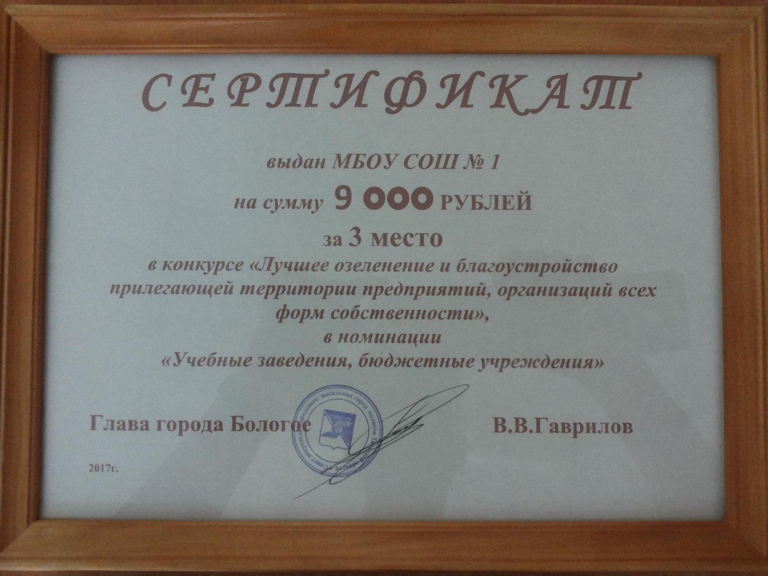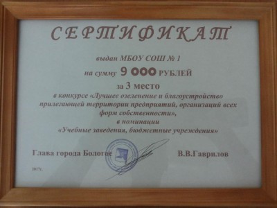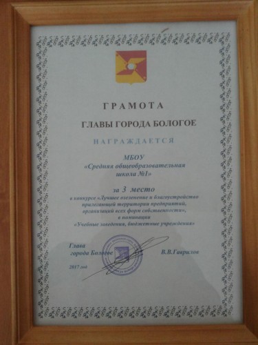 По итогам конкурса Муниципальное бюджетное общеобразовательное учреждение «Средняя общеобразовательная школа № 1» г. Бологое, Тверской области было награждено Грамотой Главы города Бологое за III место в номинации «Учебные заведения, бюджетные учреждения» и вручён сертификат на 9 000 рублей.