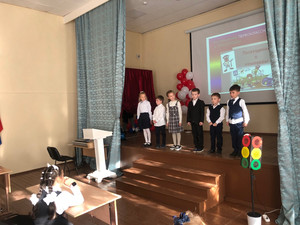 Всем известные сказочные герои разыграли весёлое представление, ребята вместе вспомнили наиболее часто встречающиеся знаки дорожного движения и сигналы светофора, поиграли в игру, потанцевали вместе с ведущими, дружно спели песню о соблюдении ПДД и получили подарок от школы - светоотражающие брелки.
