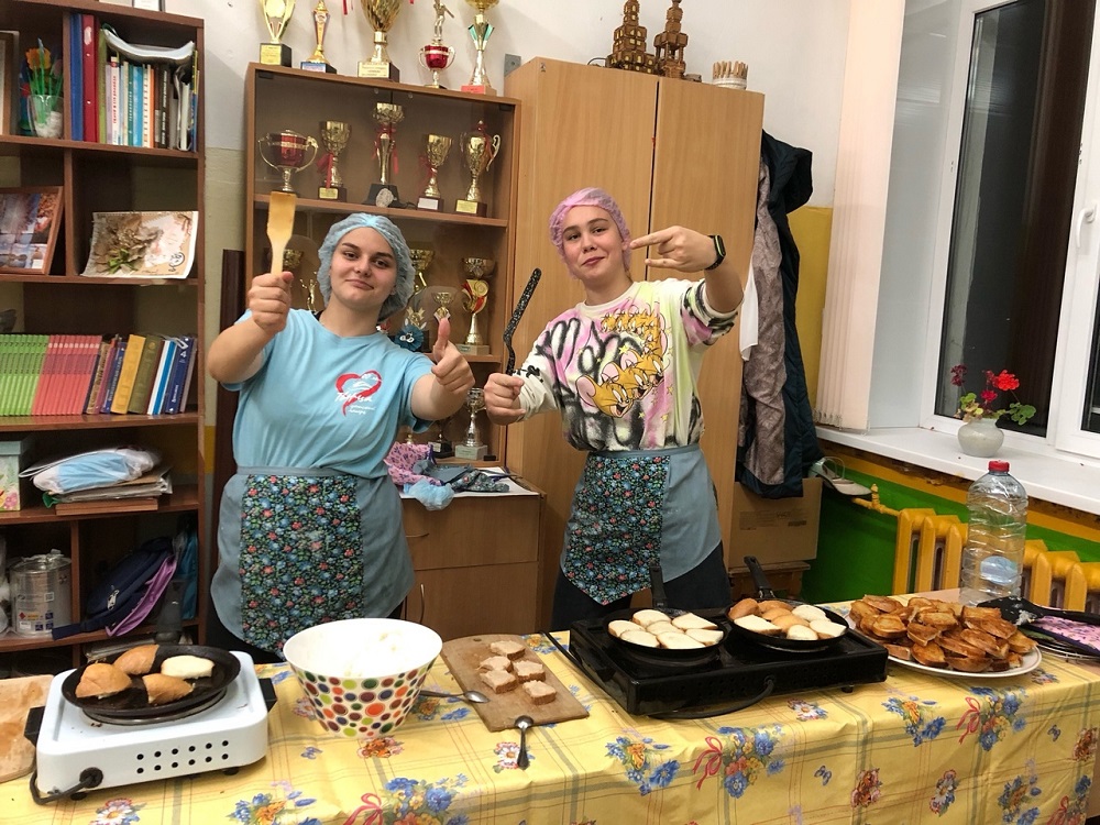 Традиционные русские блины и оладьи получились пышными, румяными и вкусными; аппетитные золотистые гренки с картошечкой; цветы из яблок для украшения стола - всё это делали ребята своими руками под чутким руководством организатора, надев униформу повара и соблюдая правила гигиены.