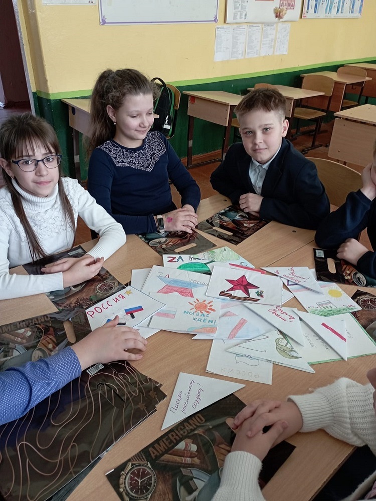 Ученики школы в своих письмах и рисунках выразили слова благодарности участникам специальной военной операции за смелость, отвагу, за свободный мир, за мир без войны. И, конечно же, ребята в каждом письме желали нашим героям скорейшего возвращения домой.