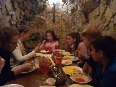 Первая половина дня была очень насыщенной, поэтому сообщение о том, что мы идем обедать, ребята встретили с большим энтузиазмом. Кормили нас в кафе «Державная». Здесь ребят также ожидал сюрприз. Кабинки оформлены в виде подземных пещер, рядом каменные изваяния волхвов, что может быть интереснее.