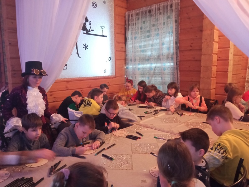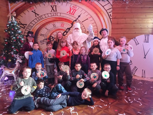 Затем все переместились в зал, где поучаствовали в весёлом танцевальном безумии, выдохнули и погрузились в изготовление настенных часов на мастер-классе, а напоследок Дедушка Мороз и герои Тики и Так напоили ребят чаем с невероятно вкусными блинами и другими лакомствами.