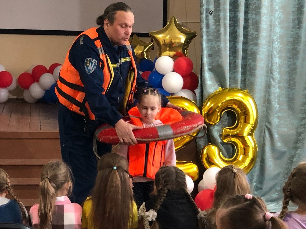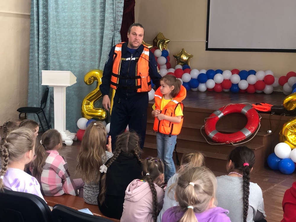 В процессе встречи ребята примеряли спасательный жилет, узнали про требования к этому важному защитному аксессуару (материал, размер и т.п.), как правильно бросить спасательный круг утопающему и многое другое.