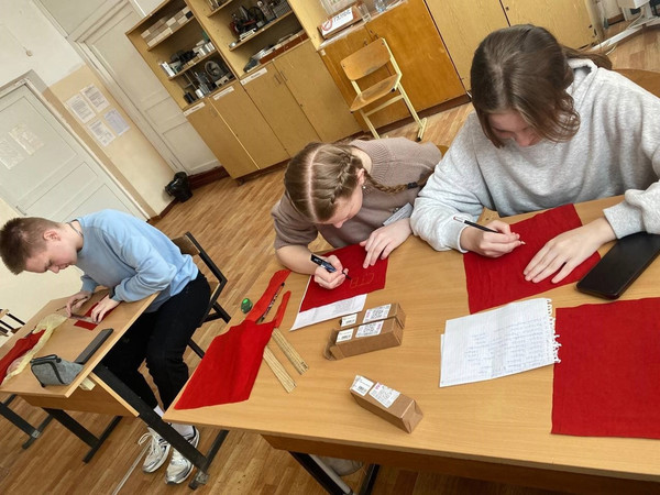 Учащиеся 10 класса Семёнов Вадим, Тихонова Каралина, Куманенко Диана, под руководством учителя технологии Чагиной О.С. создают уникальные полотна, рисуя на ткани красного цвета фамилии, имена и отчества людей , которые участвовали в Великой Отечественной войне.