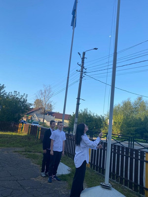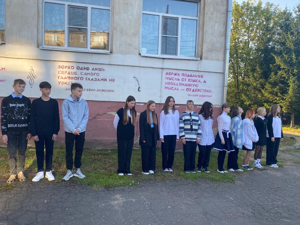 Первый понедельник нового учебного года традиционно начался с торжественной линейки, поднятия флага и исполнения гимна Российской Федерации. По традиции, сразу после линейки, ребята отправились на занятие «Разговоры о важном», посвященное Дню Знаний. Начались занятия с просмотра видеопоздравления президента В.В. Путиным.