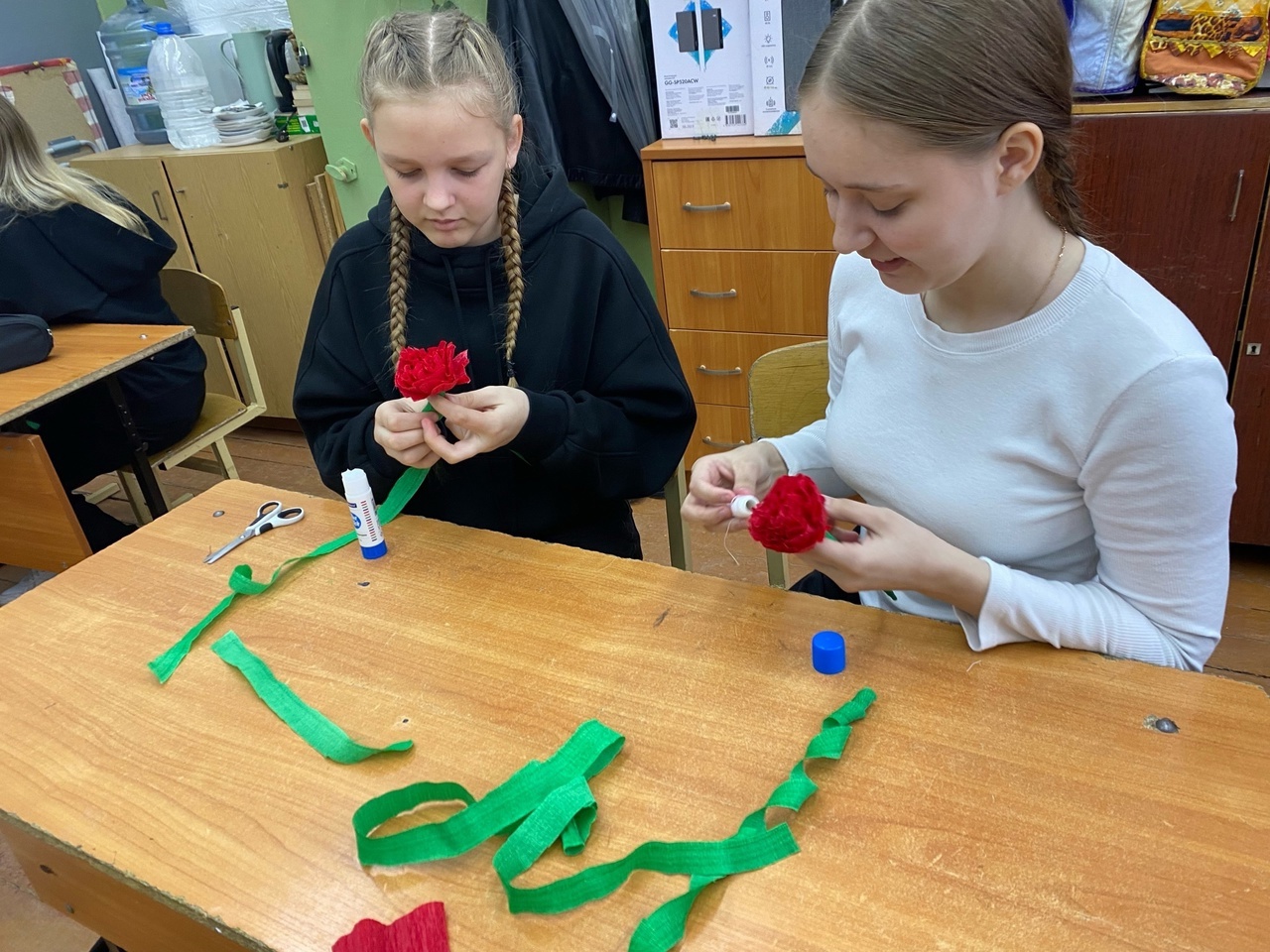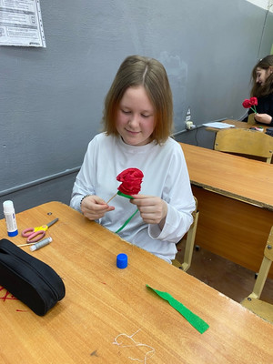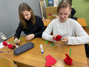 Ученики изготовили цветы своими руками на уроках технологии. Впоследствии планируется раздать их прохожим в День Победы, дабы напомнить о символизме "Красной гвоздики"