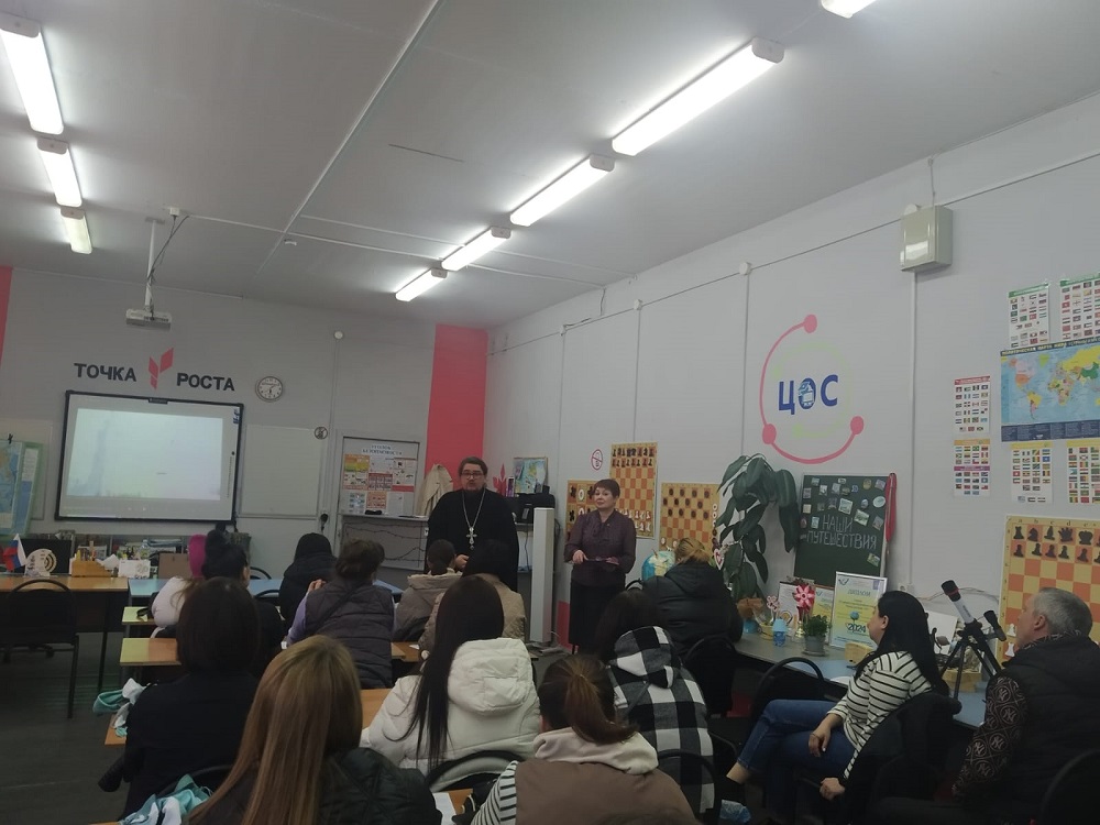 Настоятель Свято-Троицкого храма Сергей Николаевич Желябовский подробнее рассказал об одном из учебных модулей предмета ОРКСЭ «Основы православной культуры». Им был продемонстрирован фильм, раскрывающий суть данного модуля. С.Н. Желябовский в беседе подчеркнул, что, независимо от выбора учебного модуля, предмет ОРКСЭ способствует формированию первоначальных представлений о религиях, их роли в культуре, истории и современности России, дает установки личности поступать согласно своей совести; воспитывает нравственность, помогает выстраивать отношения в семье и обществе.