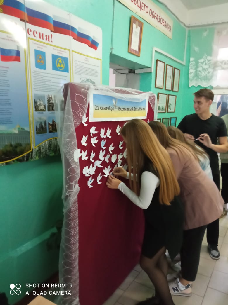 21 сентября в рамках празднования Международного «Дня мира»  в МБОУ «СОШ №1» прошла Всероссийская акция «Голубь мира».  Классные руководители рассказали ребятам об этом мероприятии. Каждый класс вырезал из белой бумаги голубей, на которых ребята написали  пожелания всем мира и добра. Затем голубей отправили в символичный полет.