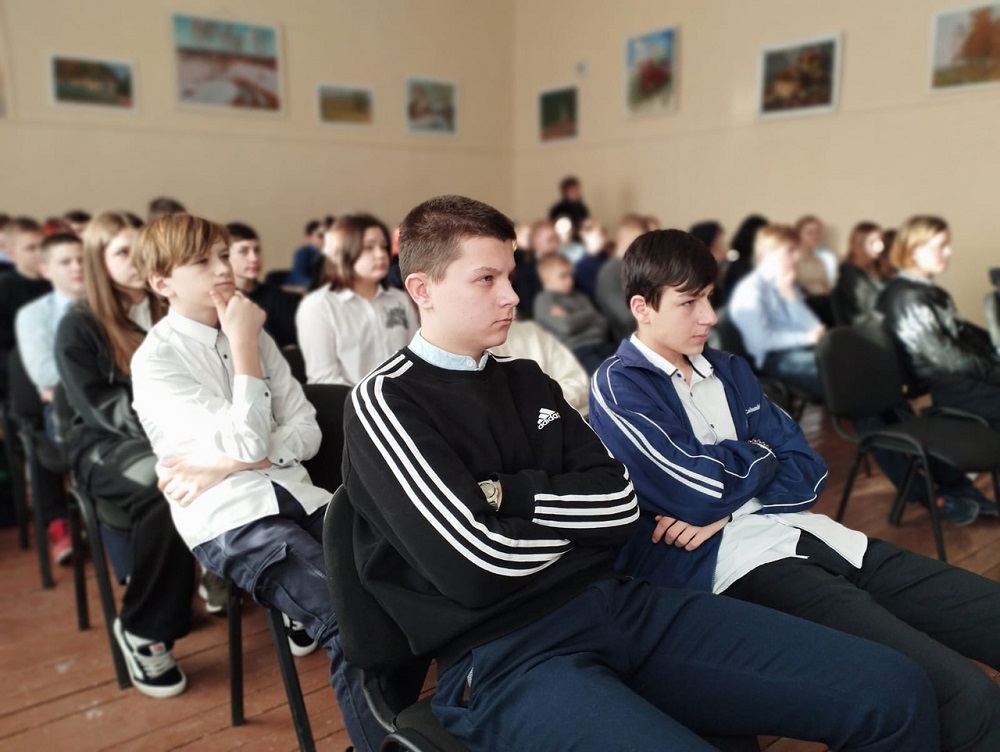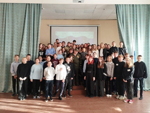 Социальный координатор фонда Алексеева Н.Е. представила семиклассникам школы участников СВО Олега Александровича Цвилева и Ивана Мухина. Олег Александрович ответил на вопросы школьников, а также рассказал, что значит защищать Отечество, почему некоторые посвящают всю жизнь защите Отечества, какими качествами обладает настоящий защитник Отечества.