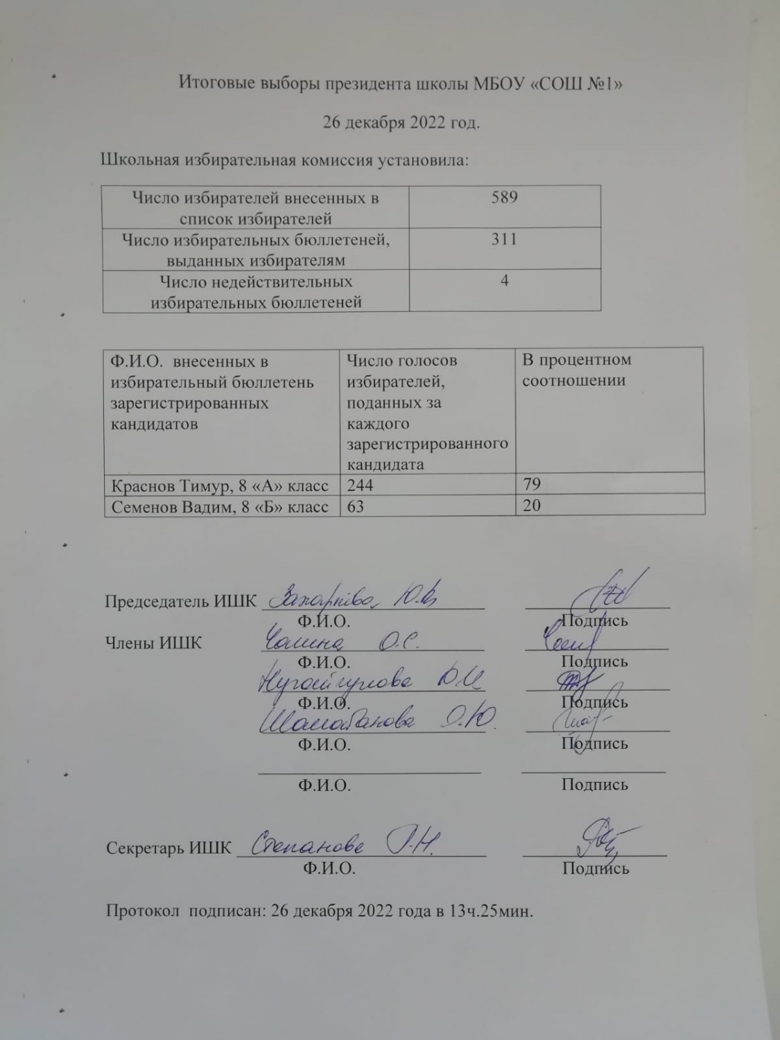 Как и в большой политике, голосование проведено тайное, и его итоги подводила специальная избирательная комиссия. Члены комиссии подсчитали бюллетени голосования. По итогам голосования Президентом школы большинством голосов был избран Краснов Тимур – 79% голосов. Семёнов Вадим набрал 20 % голосов и назначен вице-президентом школы.