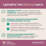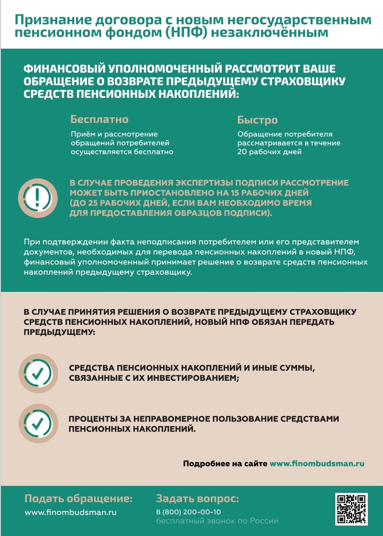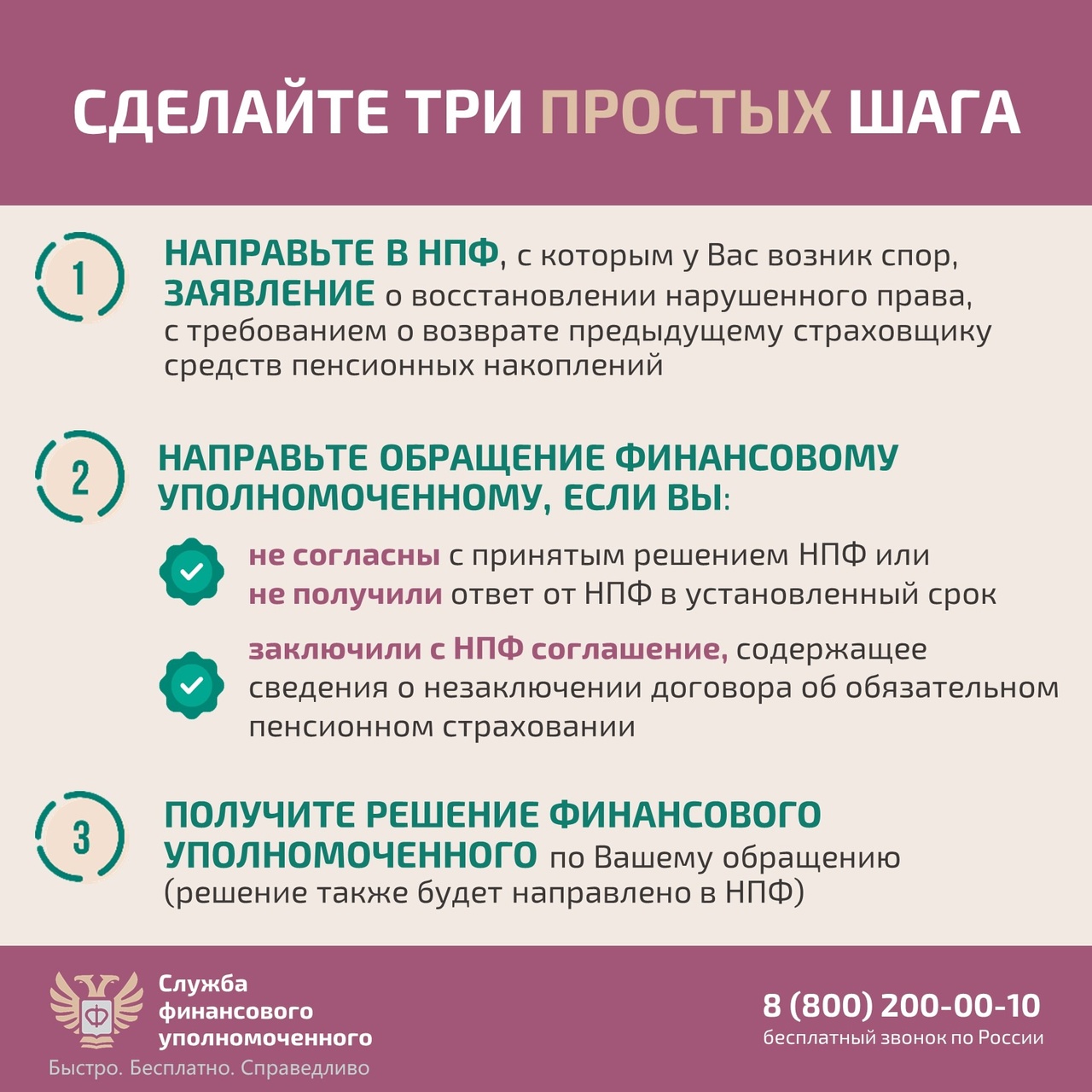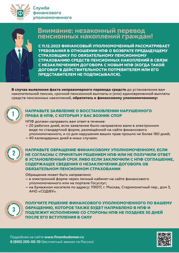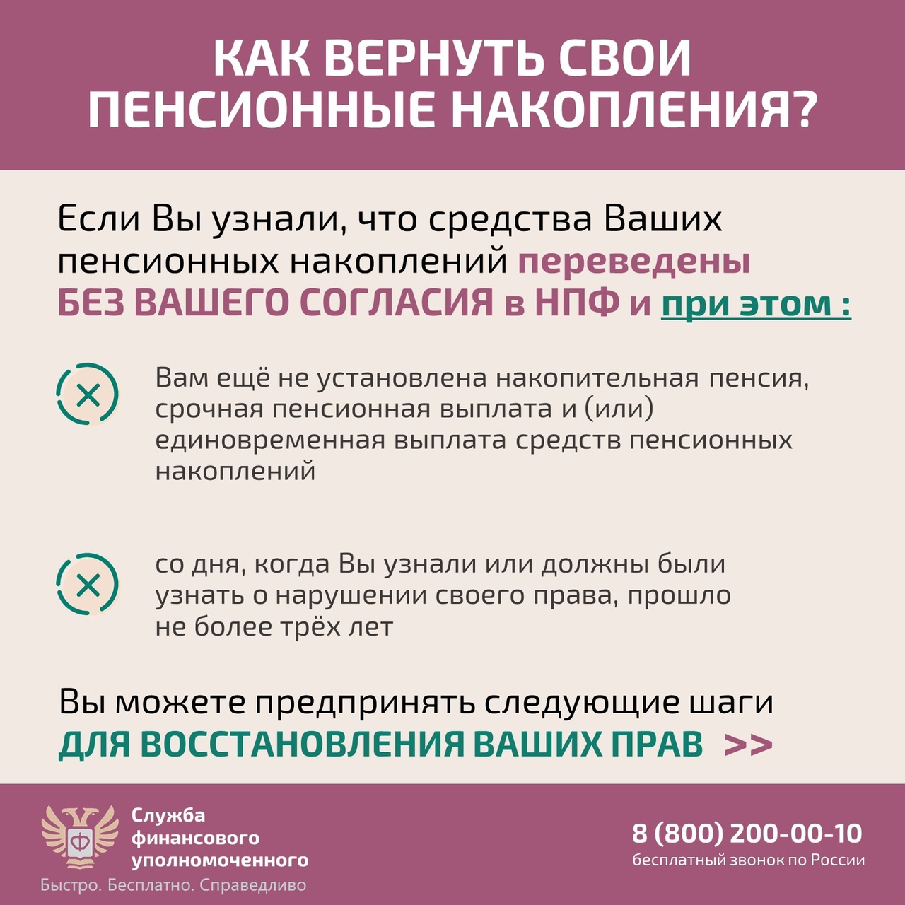 Если Вы узнали о том, что средства Ваших пенсионных накоплений переведены без Вашего согласия из Социального фонда России (СФР) в негосударственный пенсионный фонд (НПФ) или из одного НПФ в другой, направьте бесплатное обращение финансовому уполномоченному.