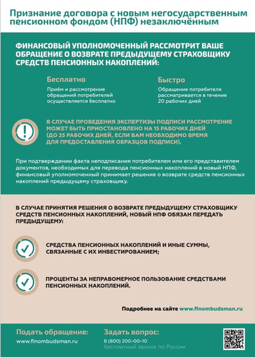 Если Вы заключили с НПФ соглашение о том, что Ваш текущий договор об обязательном пенсионном страховании является незаключенным, Вам также необходимо обратиться к финансовому уполномоченному для завершения процедуры возврата пенсионных накоплений предыдущему страховщику по обязательному пенсионному страхованию.