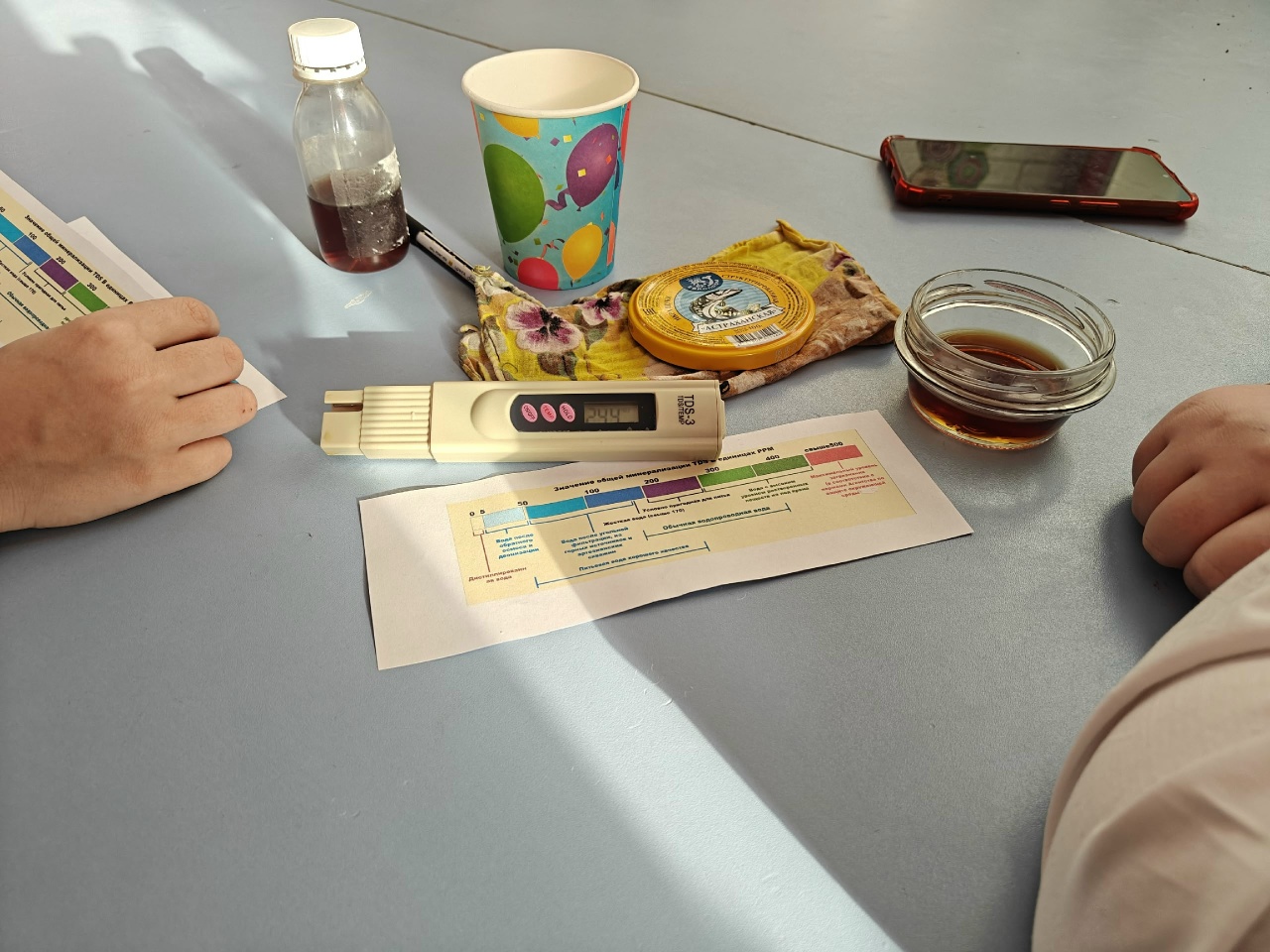 Центральным событием стала серия тестов, направленных на определение жёсткости различных жидкостей. Ребята с энтузиазмом взялись за работу, вооружившись пробирками, индикаторами и жаждой открытий. В фокусе внимания оказались такие привычные напитки и субстанции, как кока-кола, сок, ряженка, квас, столовый уксус и, конечно же, чистая вода из кулера.