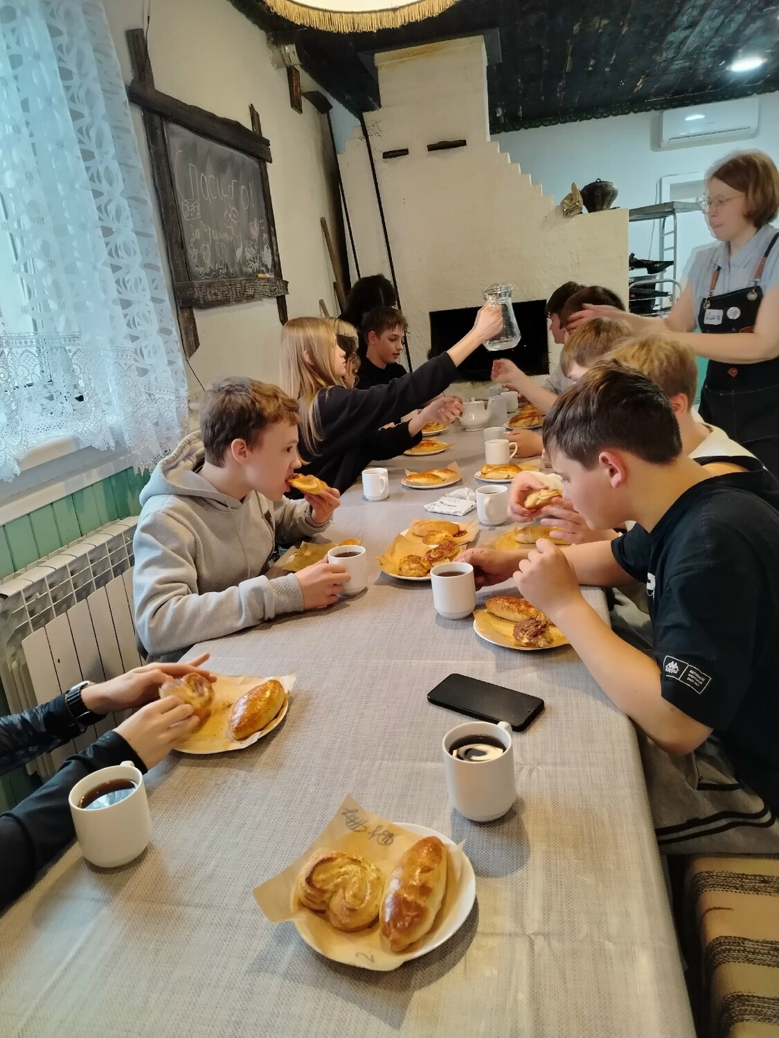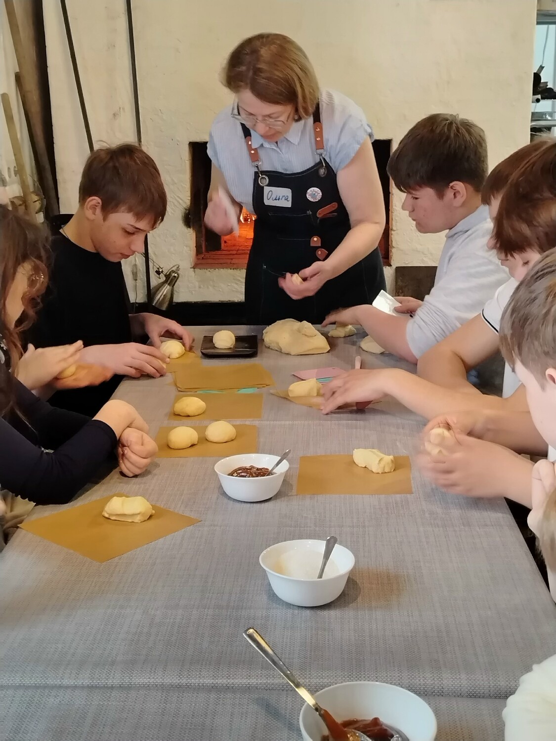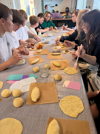 Часть вторая: магия русской печи. Затем ребята отправились в очень уютную пекарню, чтобы подкрепиться после физической работы. Здесь их ждало настоящее таинство. С помощью пекаря Ольги, мастера своего дела, ребята растопили печь и замесили тесто, а затем приступили к созданию пирожков с повидлом и булочек-завитушек. После отправки их в печь был растоплен самовар, и ребята с нетерпением стали ждать чаепития со свежей выпечкой, сделанной их собственными руками. Полежав на печи и насладившись ароматным чаем с горячей выпечкой, утомлённые, но очень довольные, ребята отправились на вокзал.