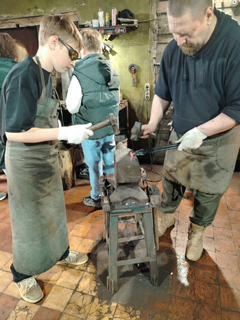Часть первая: владение металлом. Ребята закатали рукава, облачились в спецодежду, взяли инструмент и под чутким руководством настоящего кузнеца Василия превратили выбранную ими заготовку в авторский сувенир: молоточек или топорик. Пока одни работали с огнём и раскалённым железом, другие при помощи специальных инструментов создавали из медной проволоки колечки, подвески, крючки... В общем, то, на что хватало фантазии и сил. Ни с чем не сравнимое чувство, когда под твоими руками рождается что-то прочное и красивое.